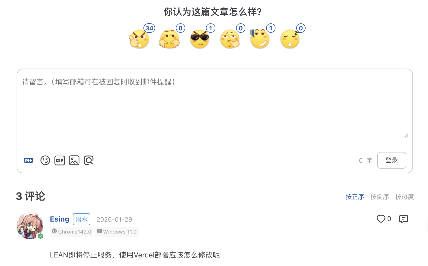 - 实在是太重了:社交集成、用户标签、文章反应,乱七八糟的功能过多,远不如 Valine 简洁
