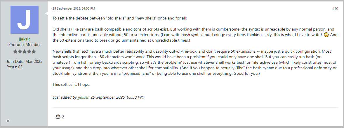这两天 fish 4.1.0 发布,看了 Phoronix 里面的几个帖子感觉还是有点难绷(当然 Phoronix 论坛里面也有一堆人喷 Rust 和 Systemd,所以也不奇怪):很多人还是完全不能把 Interactive 和 Scripting 区分开,或者会真的把一开始说的「用 Interactive 跑巨长巨复杂的命令」当作关键用法。只能评价为各种意义上都很离谱,安不安全另说,老长一串看也没法看改也没法改,跟 Regex 可以一并称之为纯纯魔法吟唱
