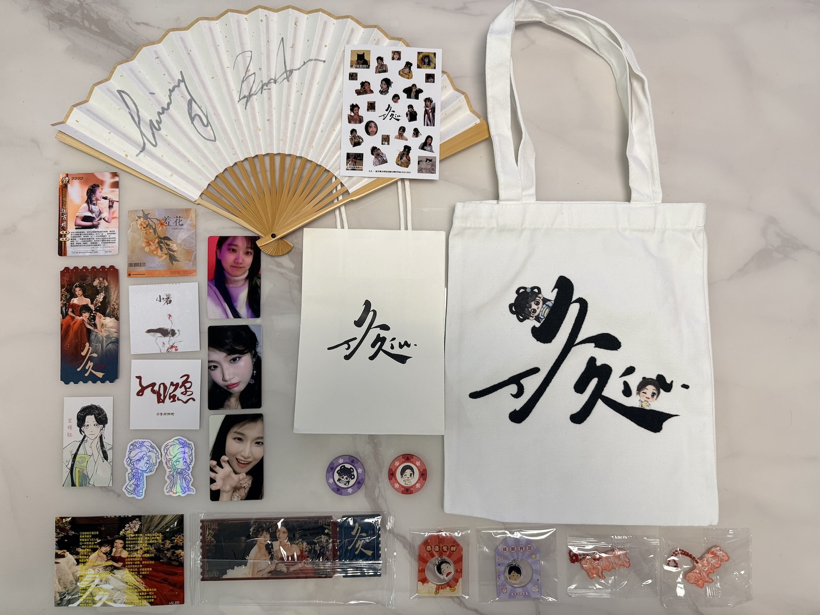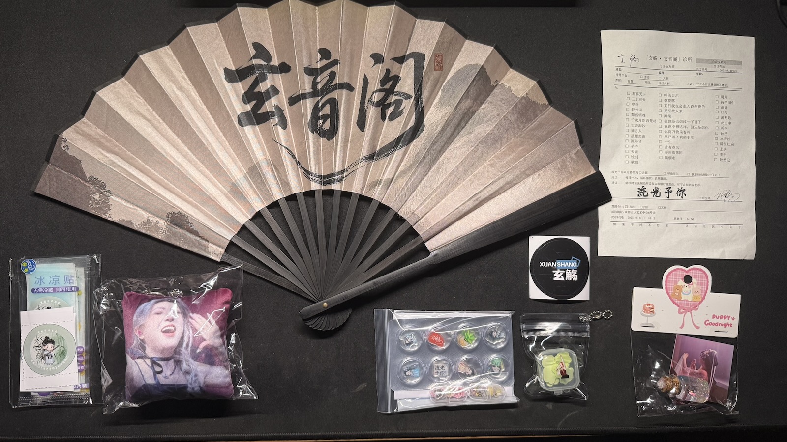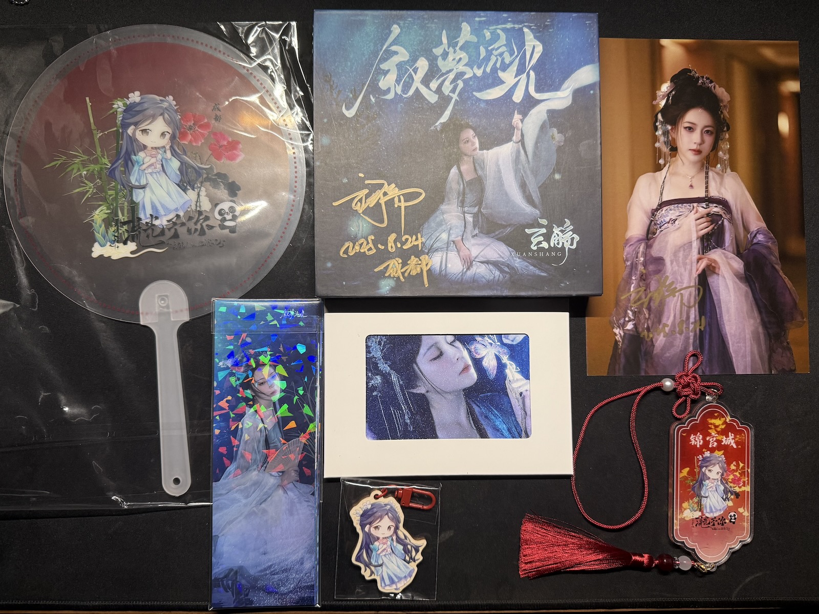 话说回来,真的是最近才知道 2022 年 11 月忙着入住新家,不仅错过了音阙诗听的实体专辑《一》还错过了六周年在东郊记忆的线下演出……着实是非常非常可惜。这次线下买了票之后就在考虑互动的时候签名到底带什么东西去签,最优选择当然是去闲鱼买一个《一》但是这玩意儿闲鱼压根就没人挂,现在是根本买都买不到;买票送的礼包也是晚上才去领。看了下群友们的计划,最终决定买一把纸扇带去
