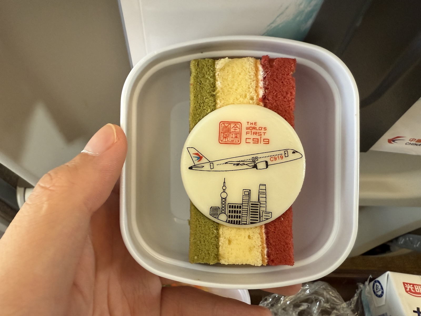 第二天回来,刚好体验了一下 C919,评价为跟 A320 几乎感觉不出什么体验上的区别,这么看应该可以说相当不错。飞机上的小装饰、飞机餐这些都很有特色,拿了个装垃圾的小纸袋子回家收藏了(