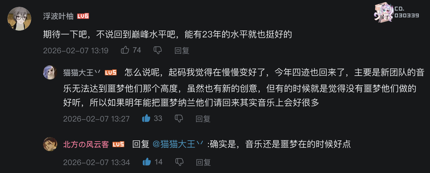 翻了一下几个预热视频的评论,就说白了听个纸片人唱歌这玩意儿也整这种粉圈一套是真让人觉得很烦,还有人吹什么触底反弹不如回去看看数据呢?尤其去年,播放量跟之前比只有两三成不说,二创更是少得可怜,甚至现在很多小 V 在直播间里面唱点年货歌还是《天知河》《不问天》,就这还回去踩噩梦那会儿的团队也真的是脸够大了。好在确实是有很多人跟草民一样觉得噩梦那个时代的歌做的真的很不错