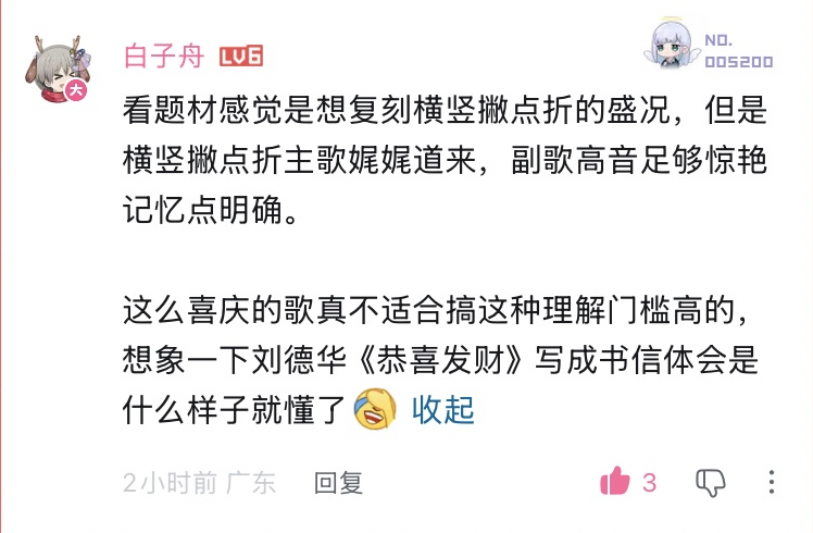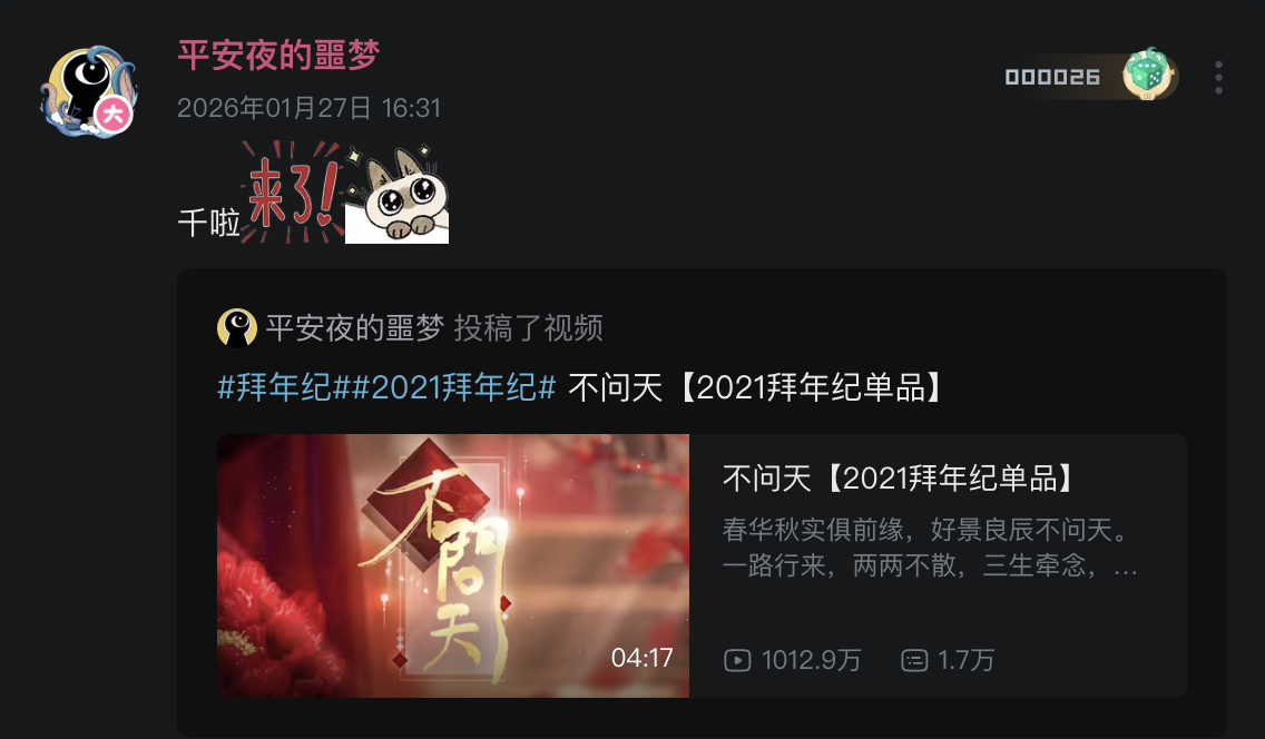 差不多 50 个小时(初二 23:30 左右)之后点了一下几首歌的播放量(下面会列出来)。咱就不说别的,上面发的忘川那首差不多 25 个小时就到 100w 了,今年年货数据最好的一首歌在 50 个小时之后也没有超过这个数,至少可以说明一点是拜年纪真拿不到多少流量资源了。想想也是,噩梦之前就说过内部员工大部分更喜欢跨晚,除夕当天晚上要跟春晚合作避免太严重的分流,初一又有自己的三次元联欢会,拜年纪这些钱少事儿多的 sb 二次元看的东西 nbcs,前置的那些预热基本也没什么意义了。至于更具体的数据,现在是清明假期,过去差不多 50 天,绝大多数单品的数据不会再有什么明显变化了。下面挑几个草民觉得最有必要评价的单品细说一下