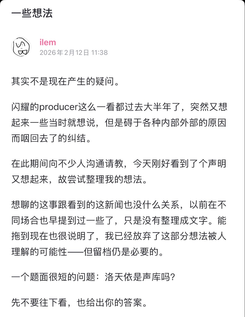 另外也锐评一下歌姬。草民五维吃得多有六成原因是真的被某家粉丝恶心到了(顺便 2.12 ilem 的动态,深以为然,一样的合成引擎给不同人用出来的根本不是一回事,而且草民日常听的那些根本不需要歌姬 IP 引流)= = 另外四成确实是因为赶上了忘川全盛时期 + Synthesizer V 当时可以称得上震撼人心的性能表现,如果有哪位朋友在 2019 年听到《天下局》的话应该能理解这一点,应该甚至到后面合成引擎 AI 化的时候都远远没有当时那种冲击力。可惜 Synthesizer V 和五维这两年社区运营和商业化做的都多少有点不怎么理想,忘川也不如全盛时期那么神挡杀神,所以现在偏正式一点的节目又大头都给 VSinger 了